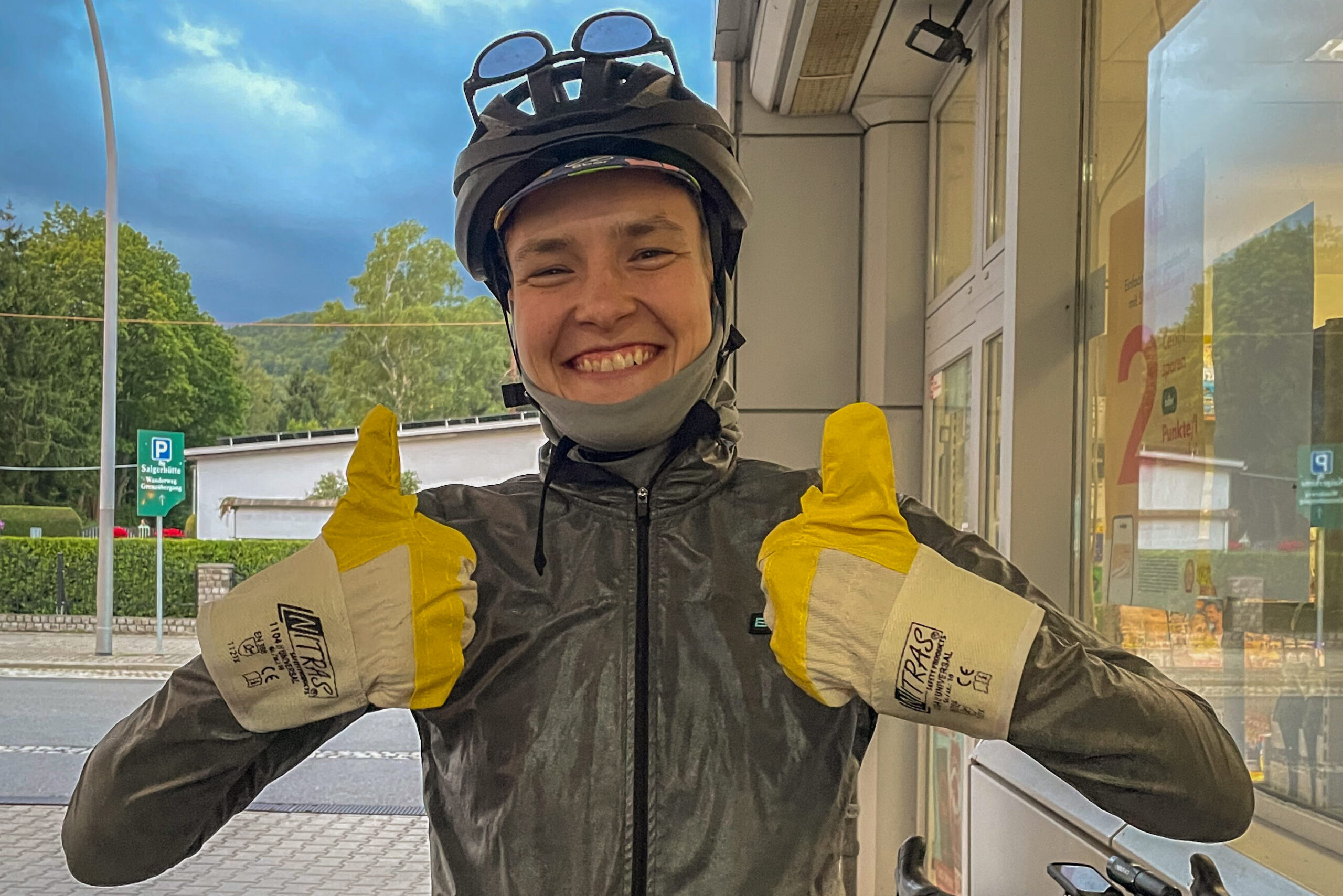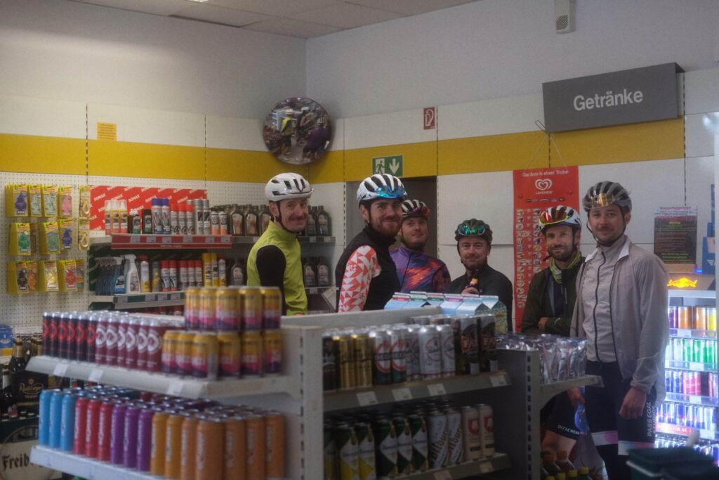 Richtung Olbernhau geht es nun viel bergab – und plötzlich scheint auch wieder die Sonne. Das tut dringend Not, denn die Hände sind mittlerweile durch Kälte und Nässe so blau wie der Himmel, den die Wolken nun fetzenweise wieder freigeben. Bei rund 150 Kilometern erreichen wir die letzte Tankstelle vor Freiberg. Einige Fahrer sammeln sich hier erneut und die beheizte Tankstelle wird zum beliebten Treffpunkt für alle, die sich nach Tee, warmem Kakao – und Notfallhandschuhen sehnen. Die Kassiererin ist mega nett und freut sich an der Metamorphose ihres Arbeitsplatzes von Tank- zu Heilstätte 😉
