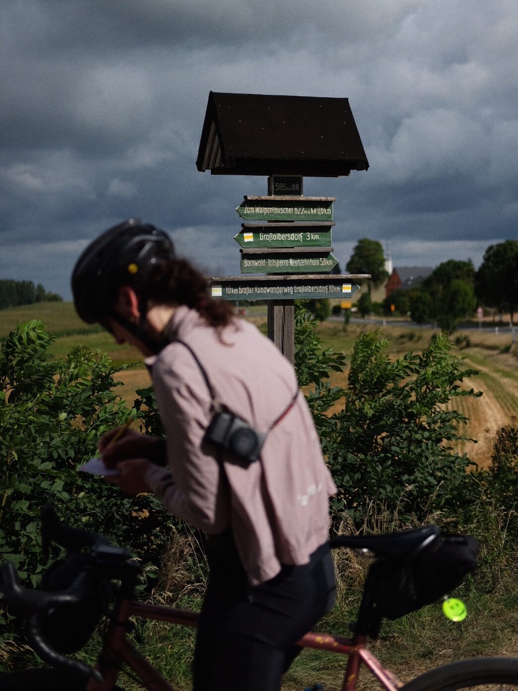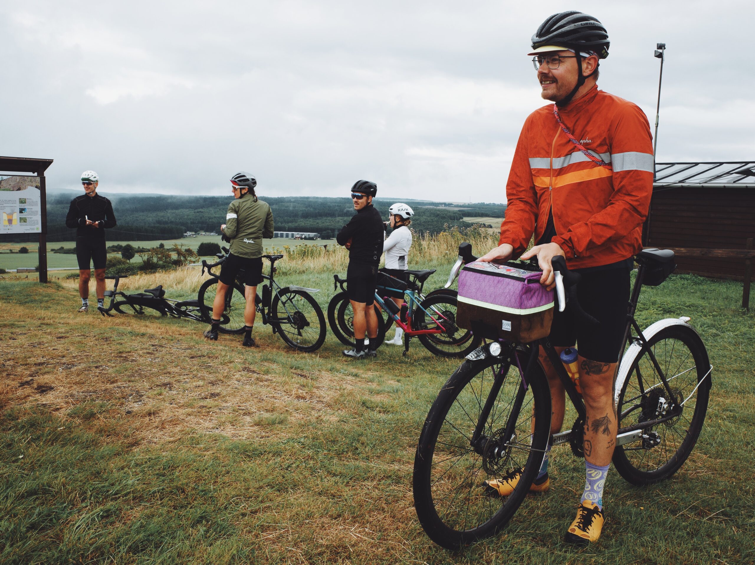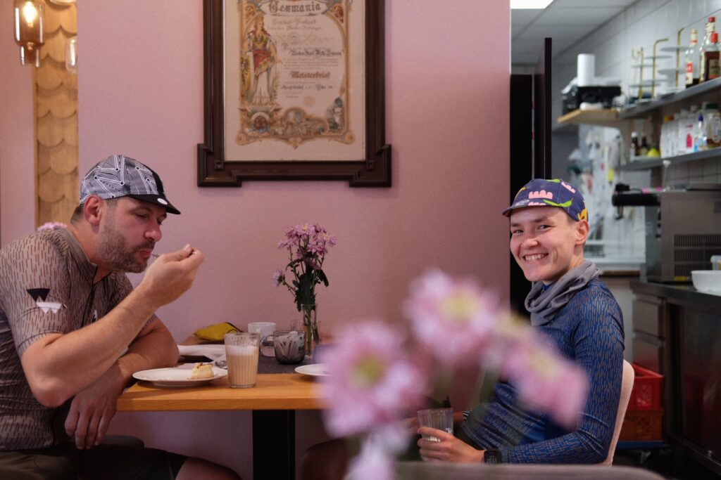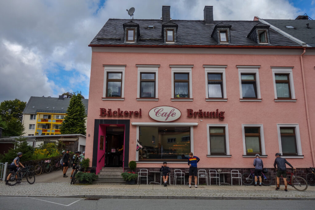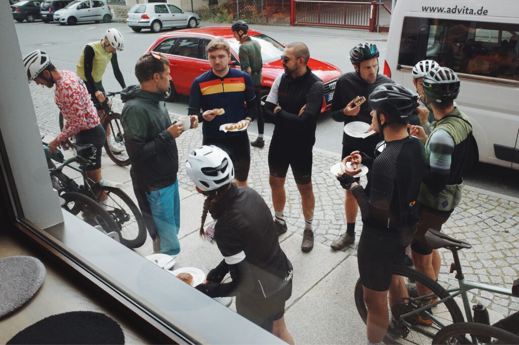 CP 2 erwartet uns nach 57 Kilometern an bzw. in der Bäckerei Bräunig. Hier herrscht großes Hallo. Viele Teilnehmende treffen wieder aufeinander, man tauscht kurze Erlebnisse aus, lacht und freut sich auf einen gemütlichen Stop. Der Chef persönlich mischt sich ins Treiben und hilft beim Stempeln der Brevethefte. Kaffee und Kuchen sorgen für neue Energie. Die samstägliche Stammkundschaft reiht sich zwischen die bunte Fahrradgesellschaft und so mancher wirft einen ängstlichen Blick in Richtung Kuchentheke: Wird es reichen? Bekomm ich meine geliebte Eierschecke? Die sehen hier alle so verfressen aus 😀 Aber keine Sorge: die Bäckerei ist bestens vorbereitet und keine Wünsche bleiben offen. Nach und nach brechen alle wieder auf und schon der nächste Anstieg mit über 10% zerreißt das Feld in lauter bunte Punkte.