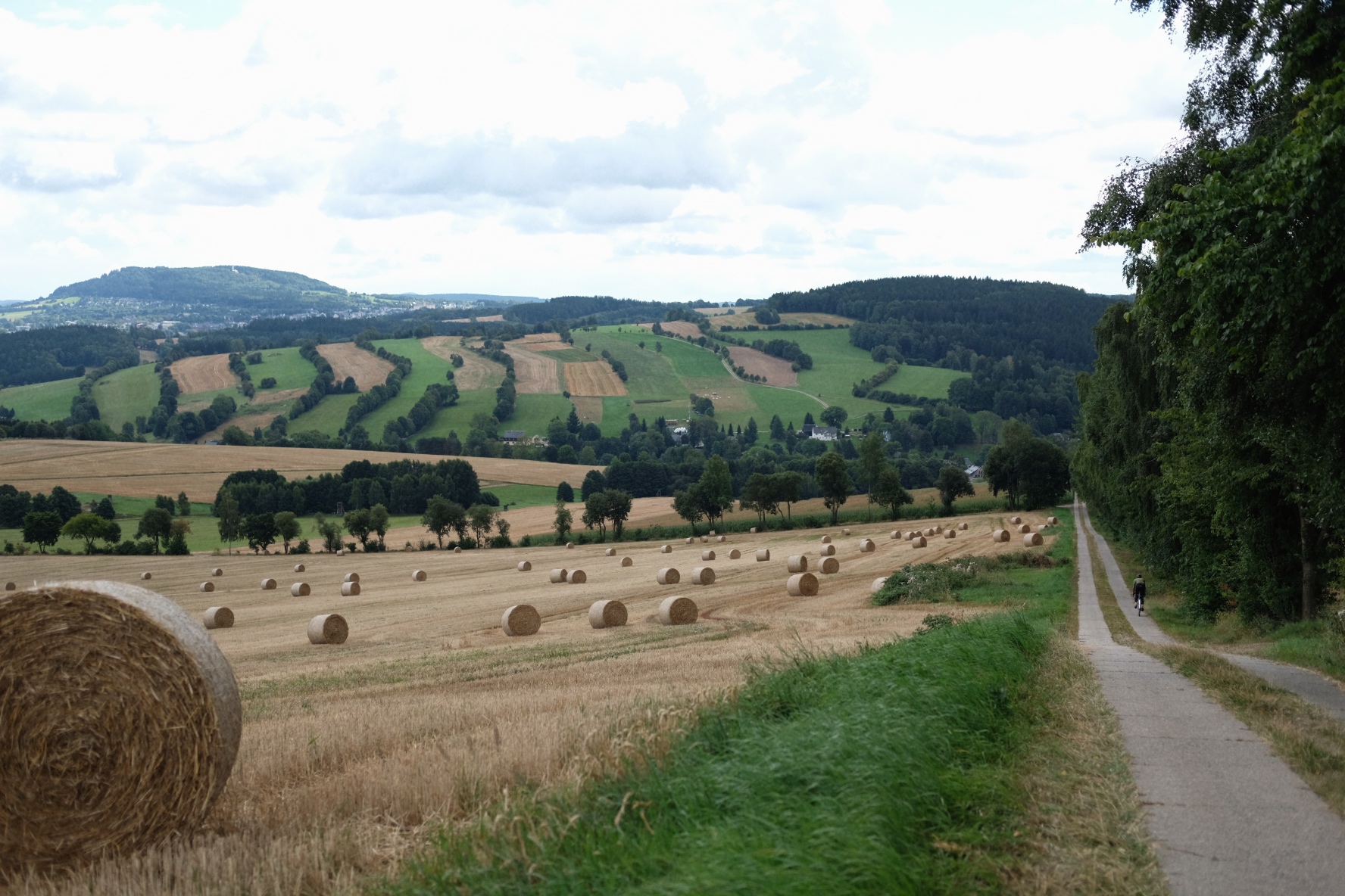 Am Checkpoint wird notiert: 29 Meter – die Tiefe der Talsperre. Danach geht es zügig weiter. Nach einem kurzen Anstieg rollen wir erst einmal lange bergab in Richtung Bärenstein, bevor wir auf weiteren Plattenwegen erneut den Pöhlberg bewundern können. Inzwischen gehört das An- und Ausziehen der Regenjacken fast schon zur Routine. Immer wieder ziehen Schauer durch.