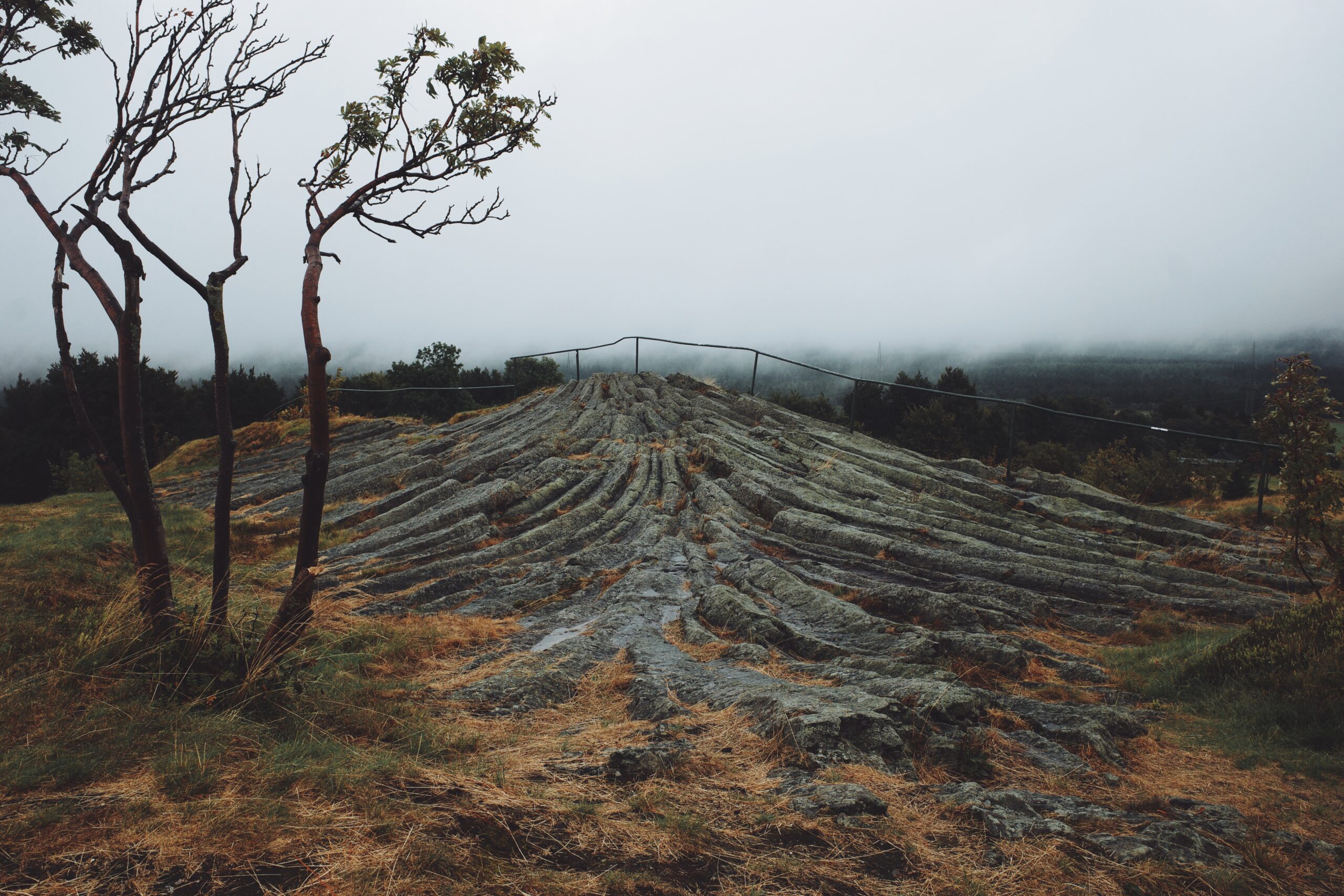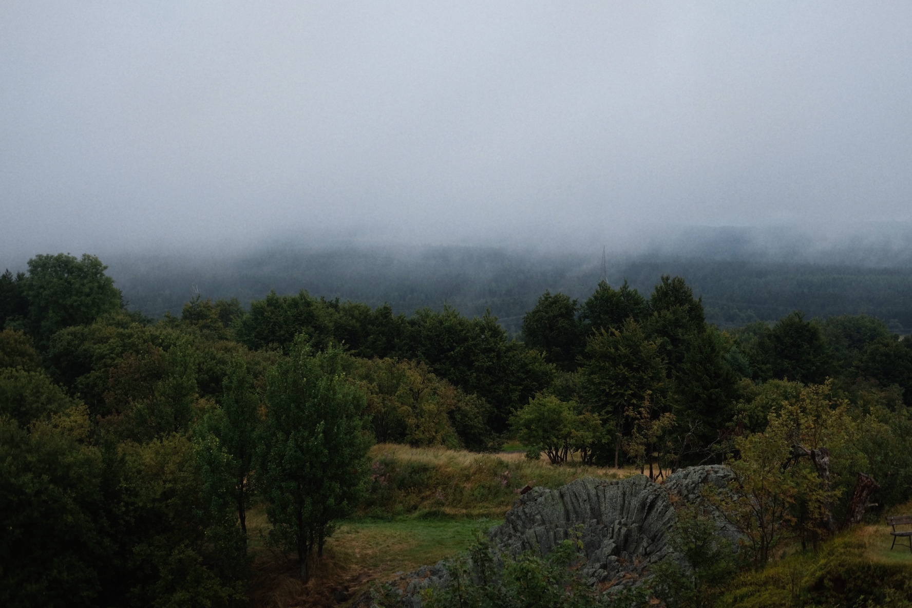 Der Anstieg zum Hirtstein fühlt sich dann fast winterlich an. Starker Regen, Nebel und oben zeigt das Garmin fröstelige 7 Grad. Aber es nützt nix, denn da oben wartet der nächste Checkpoint. Außerdem gibt es hier ein seltenes, geologisches Spektakel zu bewundern, das auch in gefrorenem Zustand beeindruckt: die Basaltfelsen, die sich hier auffächern sind Zeugnis einer bewegten Vergangenheit. Trotzdem gilt es keine Zeit verlieren, denn wer es wagt länger zu verweilen, friert einfach fest. Deshalb fix in die Schnitte gebissen , den Charakterbaum des Erzgebirges ins Brevetheft gezittert und weiter geht es.
