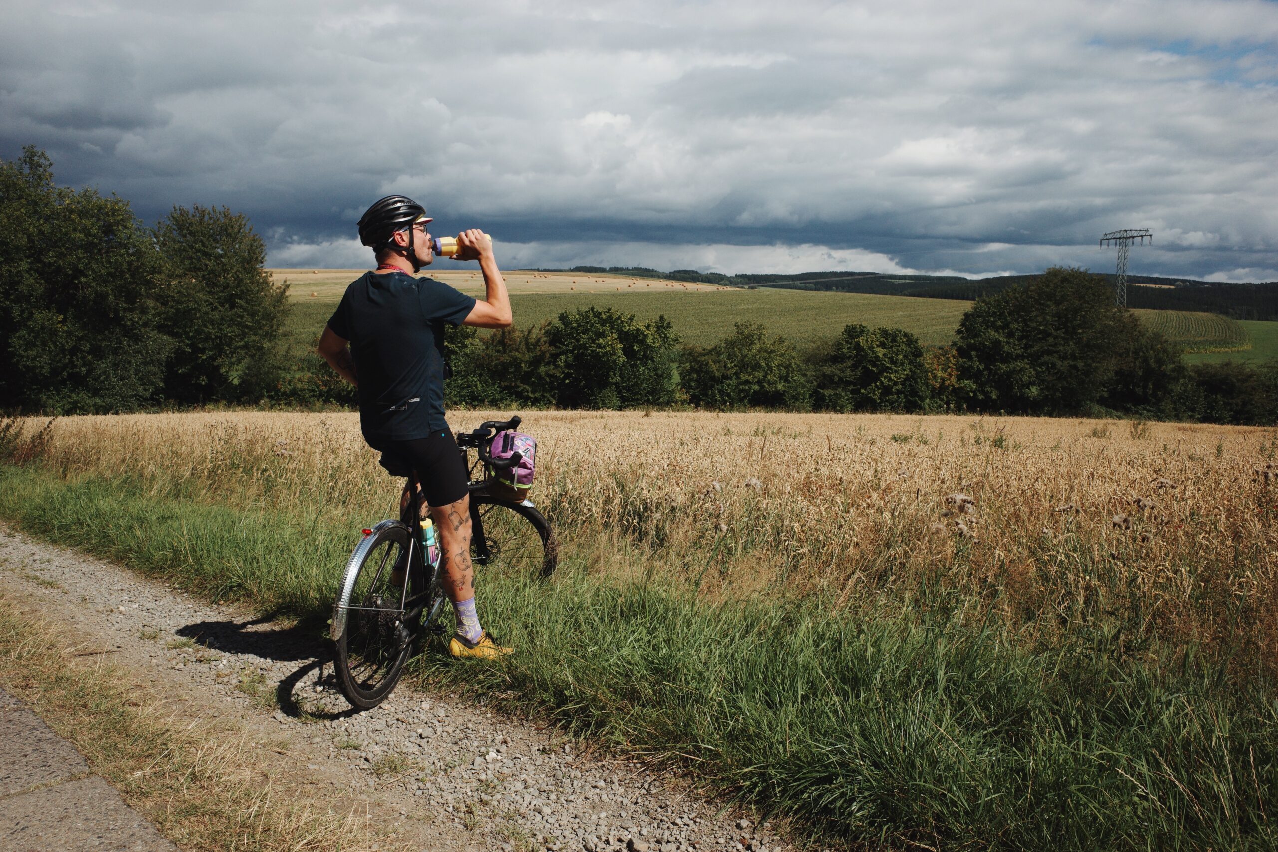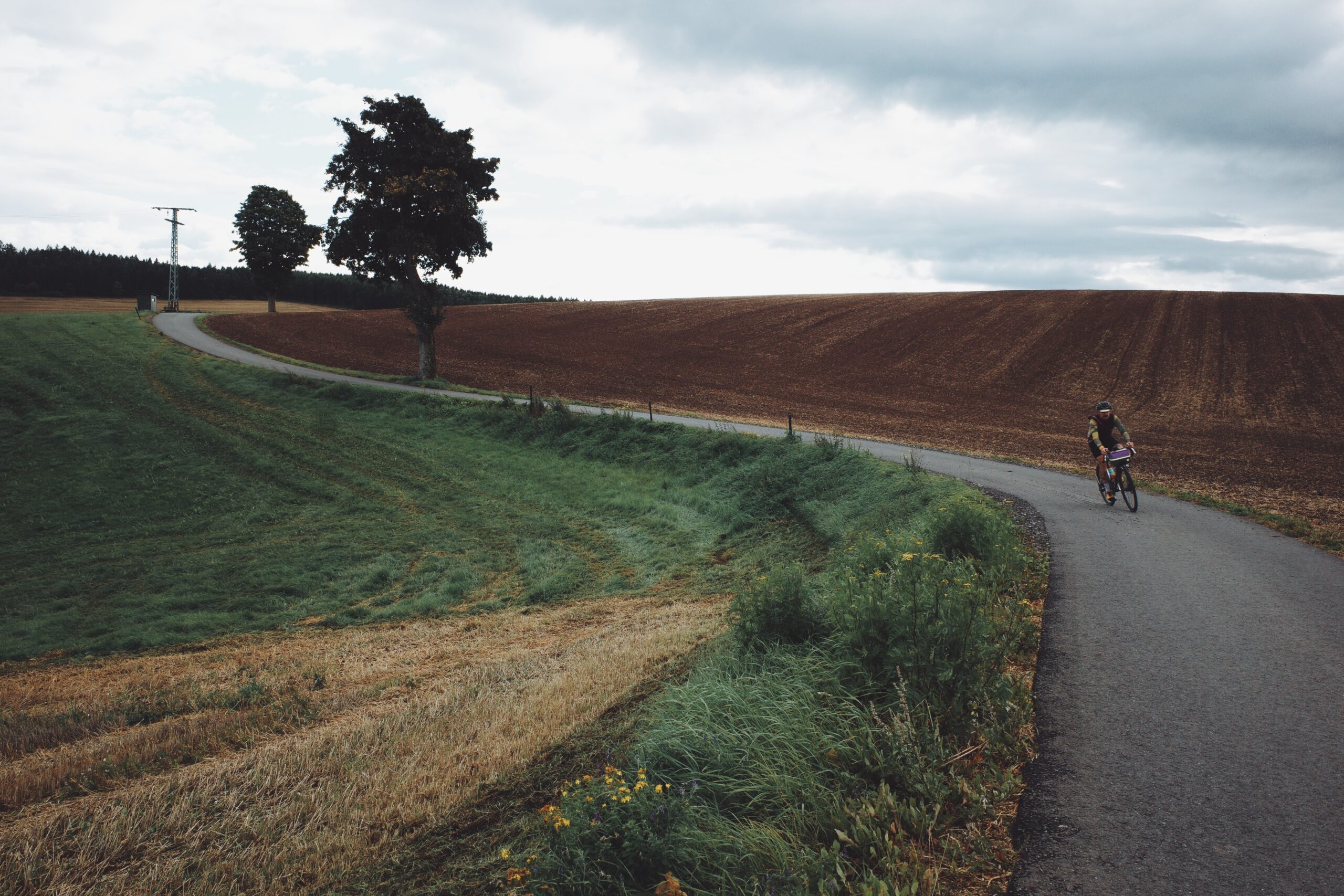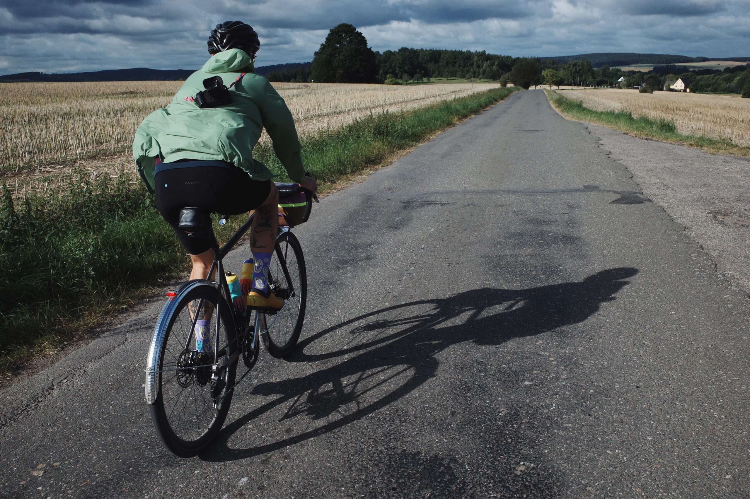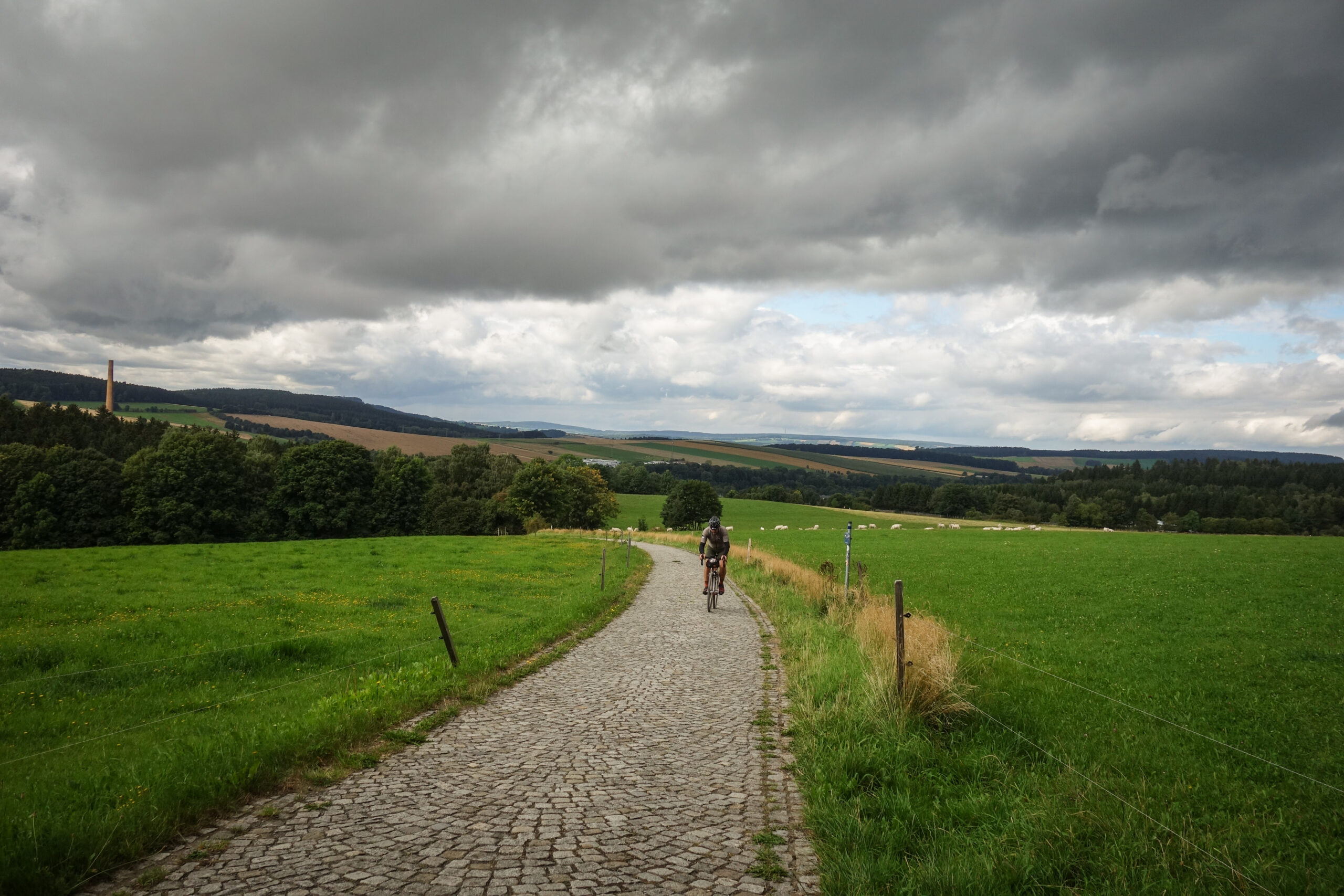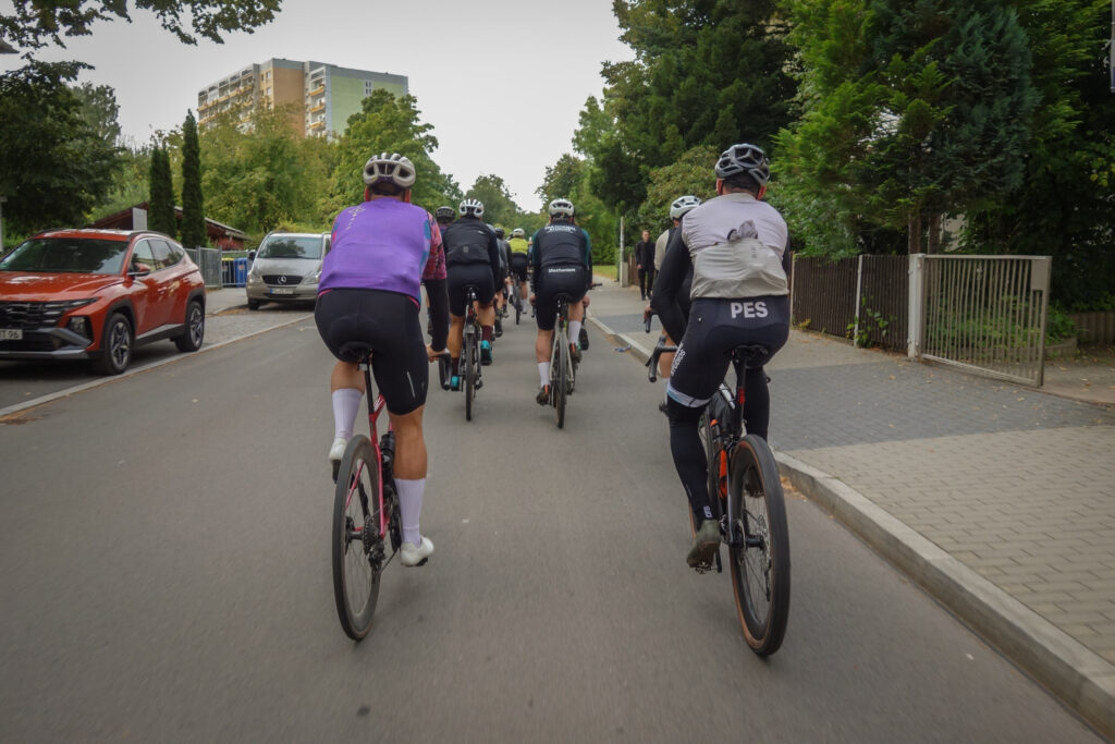 Deshalb sind alle froh, als es kurz nach acht endlich los geht. Vor uns liegen 200 Kilometer und rund 3.500 Höhenmeter. Entspannt geht es aus Freiberg hinaus, über kleine Straßen und erste Plattenwege. Das Feld ist noch ruhig, Beine und Köpfe finden ihren Rhythmus. Die ersten Kilometer bis zum Checkpoint 1 laufen entspannt und langsam fällt auch die Anspannung der letzten Tage von uns ab.